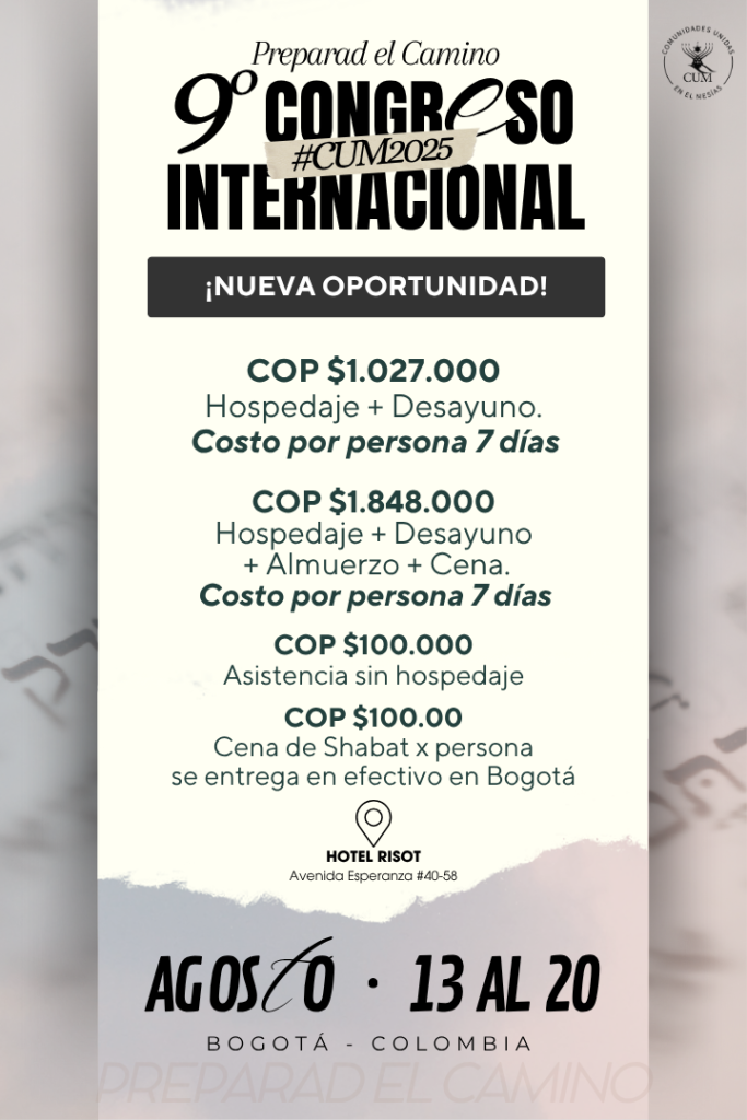 Nos complace enormemente invitarlos a participar de nuestro 9° Congreso Internacional de las Comunidades Unidas en el Mesías (CUM), que se llevará a cabo en Bogotá, Colombia, del 13 al 20 de agosto de 2025. En esta ocasión, nos reuniremos en el HOTEL RISOT, ubicado en la Avenida Esperanza #40 58, donde disfrutaremos de la maravillosa Presencia del Eterno y compartiremos en armonía junto al shalíaj Ketriel Blad, distinguidos líderes y maestros de la Palabra de diferentes países, la música inspiradora de Ketoret Worldwide y otras actividades que traerán una impartición especial para renovar nuestro compromiso y motivarnos en el cumplimiento de los propósitos divinos que impactarán nuestras vidas, comunidades y el mundo entero.